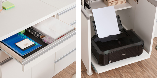 | 幅広の引出し ワイドで薄い引き出しには、ノートや手帳、筆記用具などを収納できます。よく使うアイテムを手元においておけます。 | 便利なスライド棚 プリンターを収納できるスペースは、スライド式で必要なときに引き出せて便利です。 |