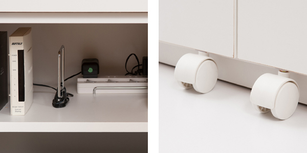 | 周辺機器もすっきり収納 棚板の後ろにもタップが置けるスペースがあり、コードを巻いて仕切れる金具も付いているので、散らかりがちな配線をすっきりまとめられます。 | 前倒れ防止キャスター付き 扉にキャスターが付いているから、開けたときも前倒れする心配がなく、安全です。 |