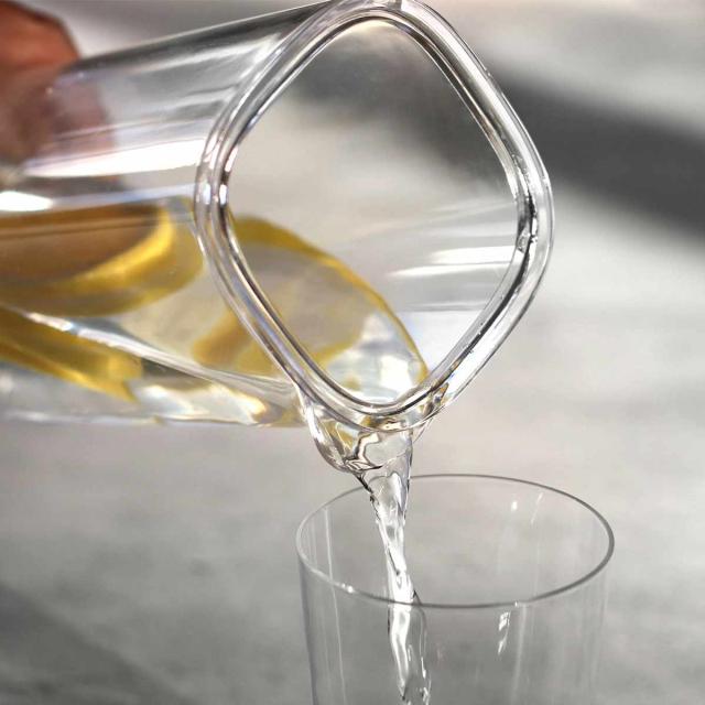 余分なものをそぎ落としたシンプルで美しいデザインのカラフェです。樹脂製で透明感のある素材を使用しているので、中のドリンクが美しく映えます。