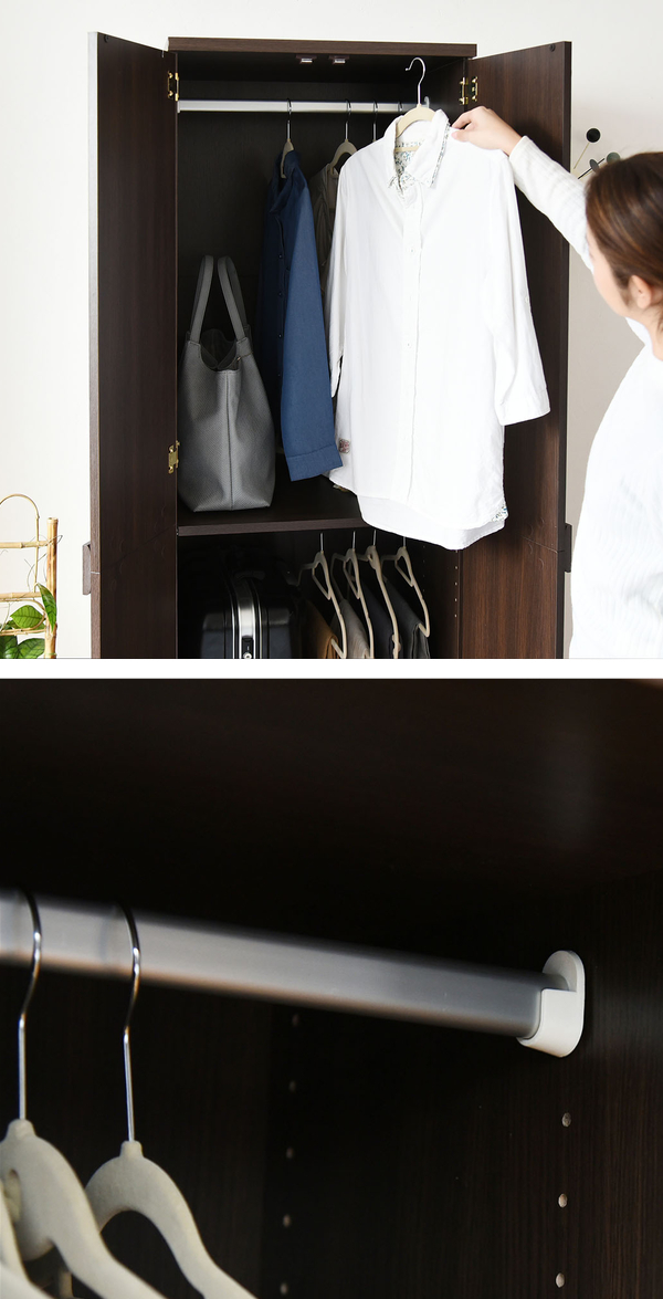 上段・下段、自分好みの衣装配置ができるタンスです。しわにならないようハンガーに掛けたまましまっておきたいお洋服もこれで安心です。