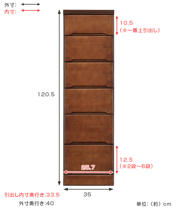 | サイズ | 約 幅35×奥行40×高さ120.5(cm) 【引出内寸】約 幅25.7×奥行33.5×高さ(一番上引出し)10.5、(その他引出し)12.5(cm) |