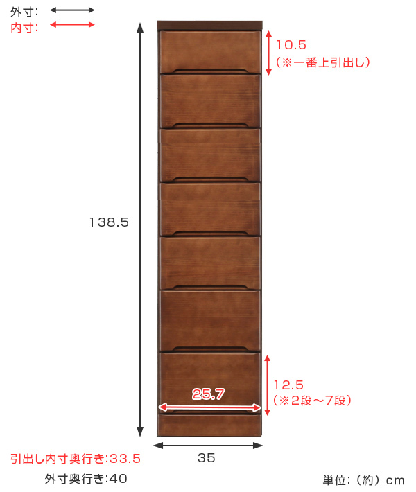 | サイズ | 約 幅35×奥行40×高さ138.5(cm) 【引出内寸】約 幅25.7×奥行33.5×高さ(一番上引出し)10.5、(その他引出し)12.5(cm) |