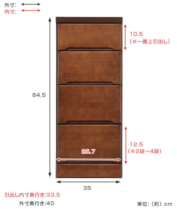 | サイズ | 約 幅35×奥行40×高さ84.5(cm) 【引出内寸】約 幅25.7×奥行33.5×高さ(一番上引出し)10.5、(その他引出し)12.5(cm) |