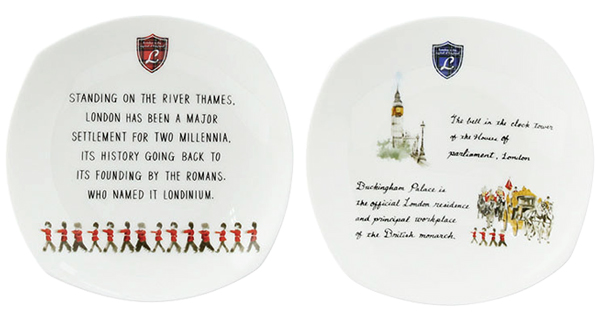 白地にアルファベットや近衛兵、宮殿の絵柄が可愛らしいプレートです。