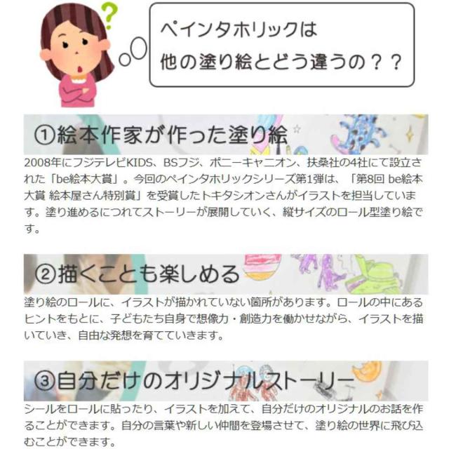 フジテレビKIDSと脳科学者の茂木先生が監修し、子どもの自由な発想を育てることをテーマに生まれた、今までにない新しい形のロール型塗り絵です。塗るだけでなく、描く楽しさを満たし、みんなで描くことで新しい楽しさを見つけられる、そんな子どもの気持ちに寄り添って作られたブランドです。