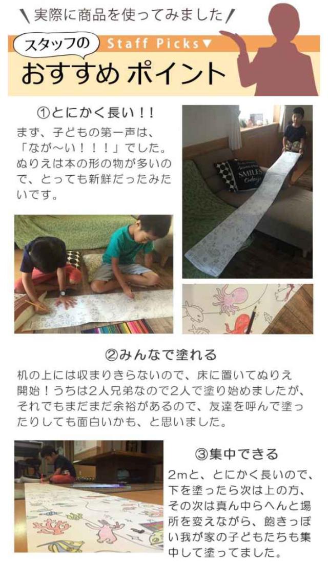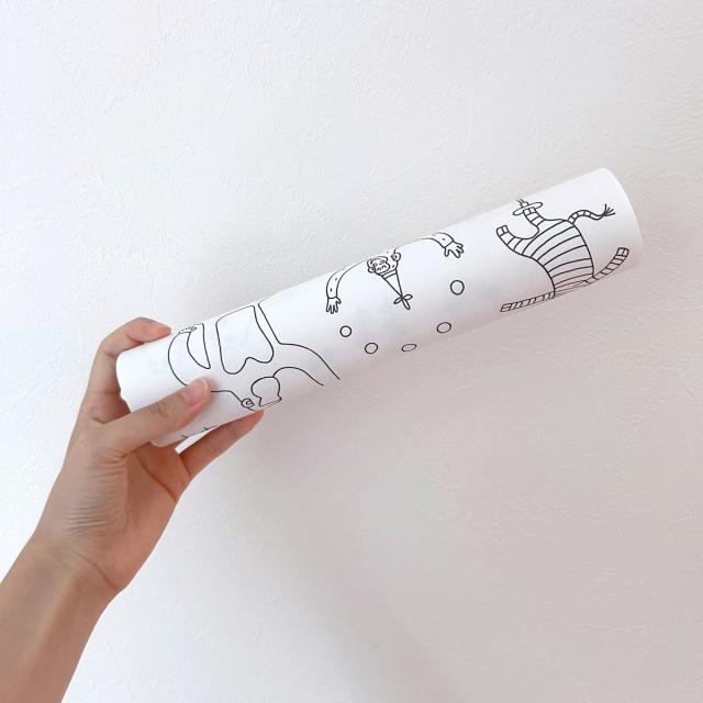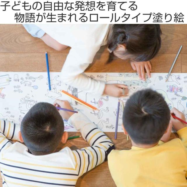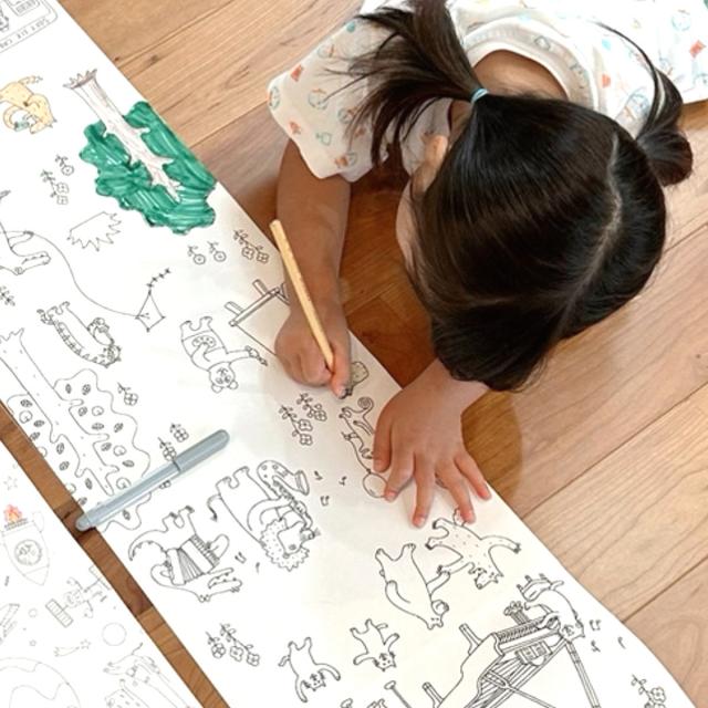 ロール状の塗り絵は広げると長く、子どもたちの好奇心をかき立てます。色を塗るだけではなく、余白にセリフやキャラクターを書き足してオリジナルのストーリーを作り出すことができます。長いのでお友達と一緒に楽しみながら塗り絵ができ、会話も広がります。