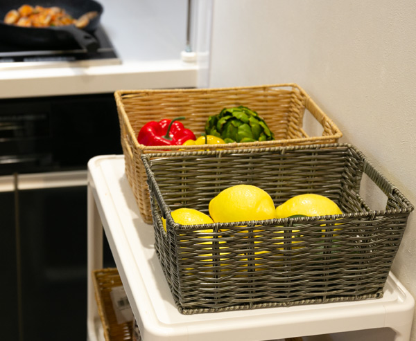 ポリプロピレンを編み込んだ通気性の良いバスケットなので、果物や野菜、乾物などの食材ストックを収納するのに最適です。