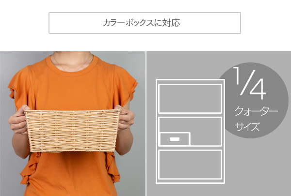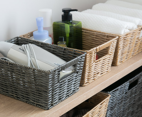 こちらはドライヤーやブラシ、化粧水などの美容小物の整理に最適なクォーターサイズですが、フェイスタオルやバスタオル、衣類などを入れられるサイズも展開しており、シリーズで揃えて整頓することで、すっきり統一感のある空間を演出できます。