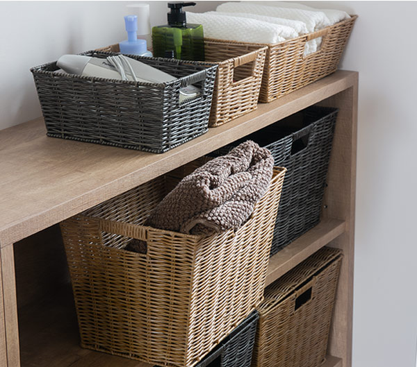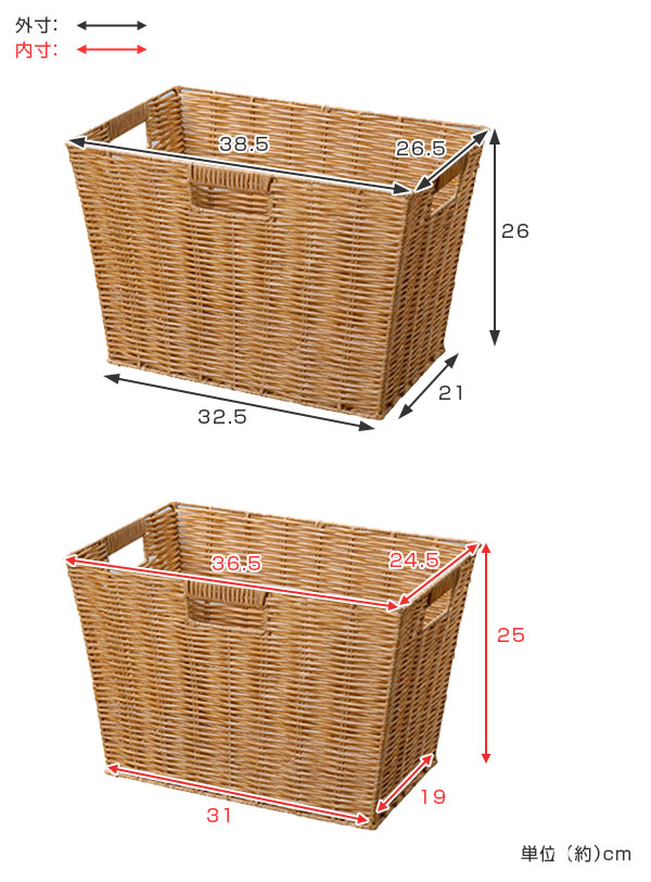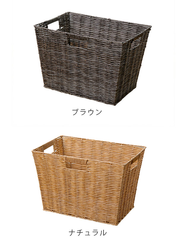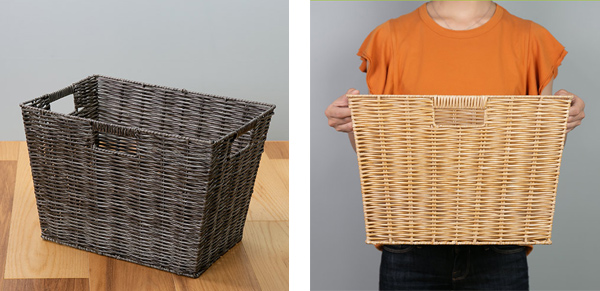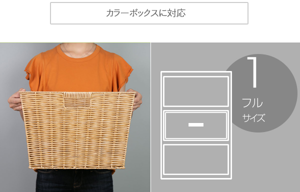 ![]() 雑誌や新聞を収納したり、ひざ掛けを入れておくのにもちょうどいい深型のバスケットです。 どんなテイストのインテリアにも馴染みのよいナチュラルな風合いです。 本体素材にはツルッとした質感のポリプロピレンを採用しており、水に強く生活の様々なシーンで活躍します。 ![]() ![]() 通気性の良さ・お手入れのしやすさ ポリプロピレンを編み込んだ通気性の良いバスケットなので、果物や野菜、乾物などの食材ストックを収納するのに最適です。500mlのペットボトルを立てて収納できます。 キッチンで水や油がとんでしまっても、サッと拭ける素材なので安心です。 ![]() 水につよい素材 水周りの整理整頓にも最適な素材です。 こちらはバスタオルや脱衣の収納に最適な深型サイズですが、ドライヤーやブラシ、化粧水などの美容小物の整理に最適なサイズや、フェイスタオルや衣類などを入れられるサイズも展開しており、シリーズで揃えて整頓することで、すっきり統一感のある空間を演出できます。 (ページ下部のシリーズ紹介より各サイズの販売ページへジャンプできます。) ![]() インナーボックスとして カラーボックスのインナーボックスとしても使えるサイズ設計です。 横40cmのカラーボックス1段に1点収納できます。(こちらはフタなしタイプの販売ページです。) ![]() ![]() 軽くて丈夫・扱いやすい素材 本体素材には軽くて丈夫なポリプロピレンを採用しています。ツルッとした質感で水に強く、汚れてしまった時にサッと拭けるのでお手入れが楽にできます。(※耐水性に特化した商品ではありません。) ![]()