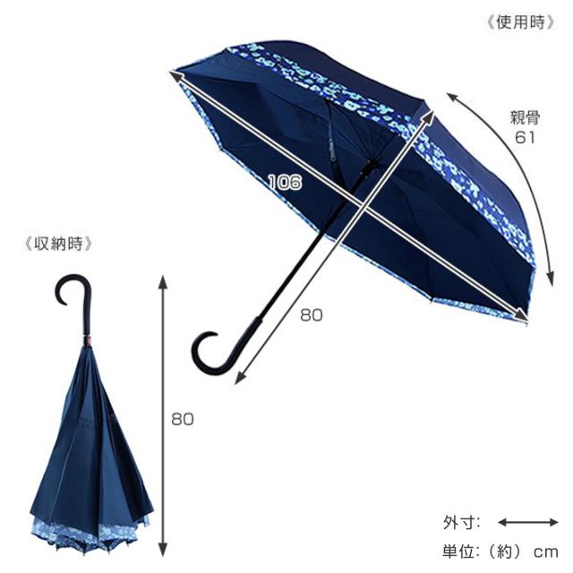 | サイズ | 使用時 全長:約 80(cm)、親骨の長さ:約 61(cm)、直径:約 106(cm) 収納時 全長:約 80(cm) |