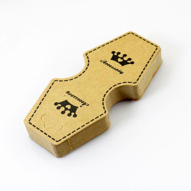 王冠とハートをデザインしたベージュ色の2つ折りにして使うピアスとブレスレットやヘアゴムなど長いアクセサリーをディスプレイするのに便利なクラフトペーパー。ピアス用の穴が2か所開いているので、スタッドピアス、キャッチピアスはもちろん、フックピアスやチェーンピアスやアメリカンピアスをディスプレイでき、折った部分にはピアスと一緒にネックレスやアンクレットを飾れるペーパータグ。