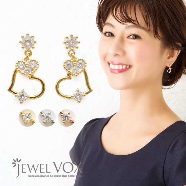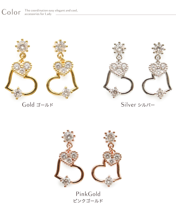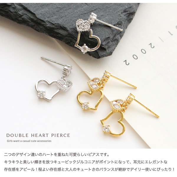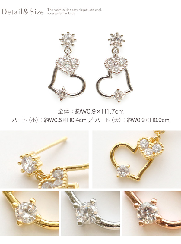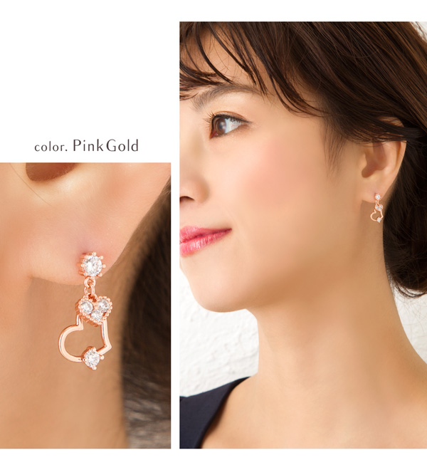 | 二つのデザイン違いのハートを重ねた可愛らしいピアスです。 キラキラと美しい輝きを放つキュービックジルコニアがポイントになって、耳元にエレガントな存在感をアピール! 程よい存在感と大人のキュートさのバランスが絶妙でデイリー使いにぴったり! | |