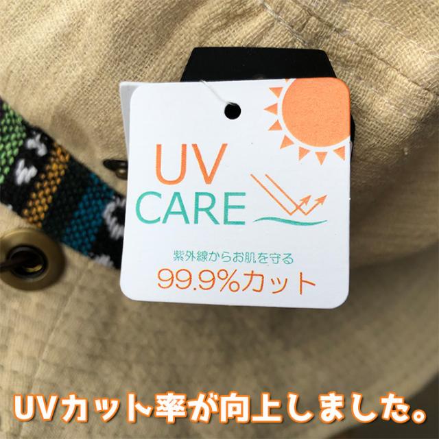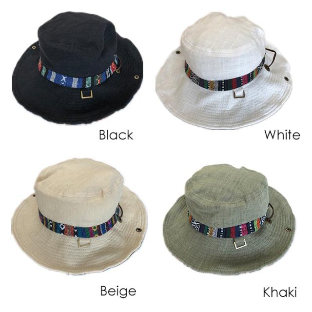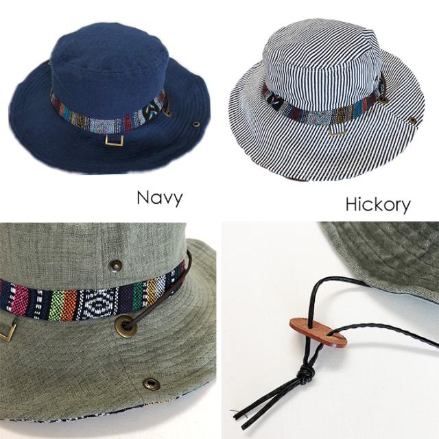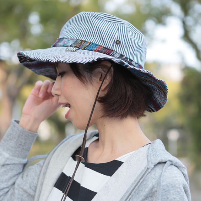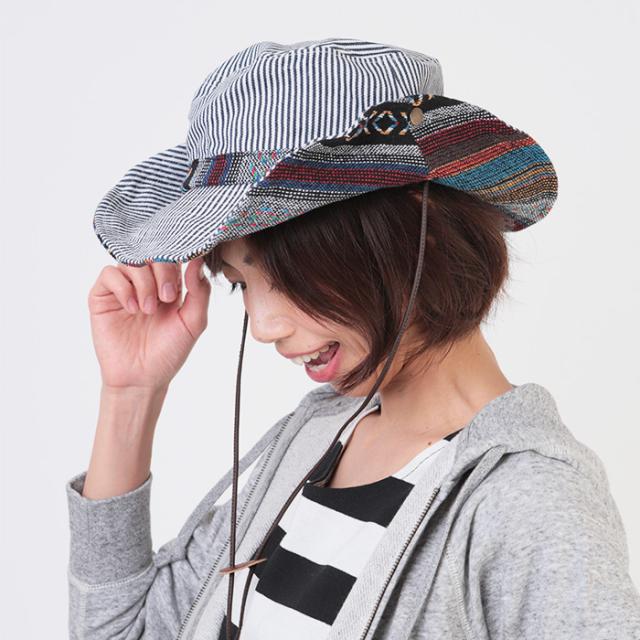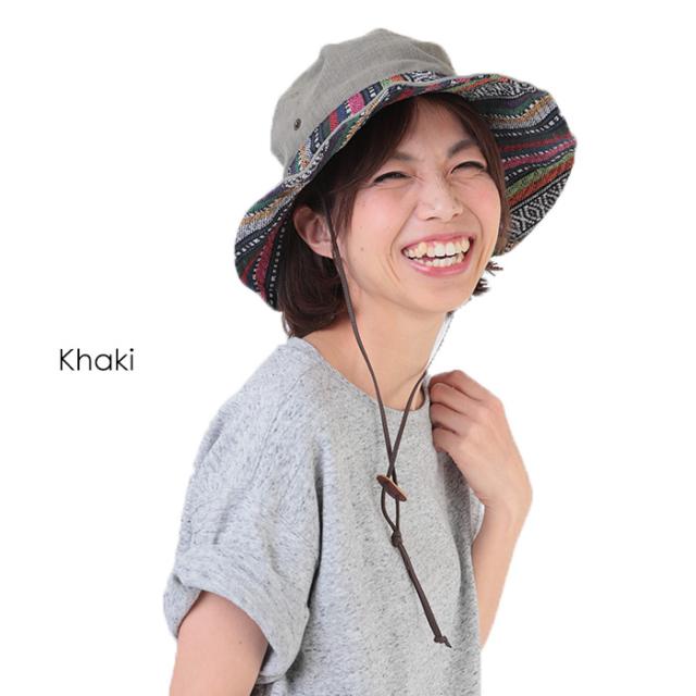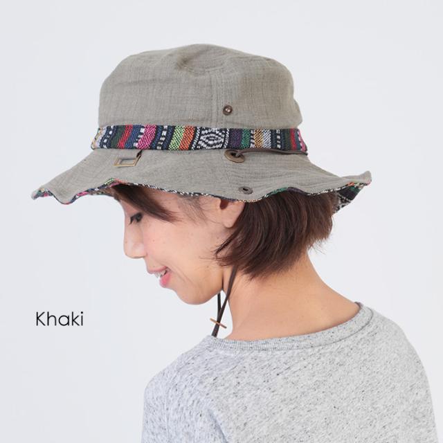 ■紫外線対策■ UVカット率が99.9%に向上しました。 夏らしさを強調した綿素材を使ったアドベンチャーハット。 アクセントを利かせたネイティブ柄のベルトを取り入れています。 つば裏全体にもネイティブ柄を施しました。