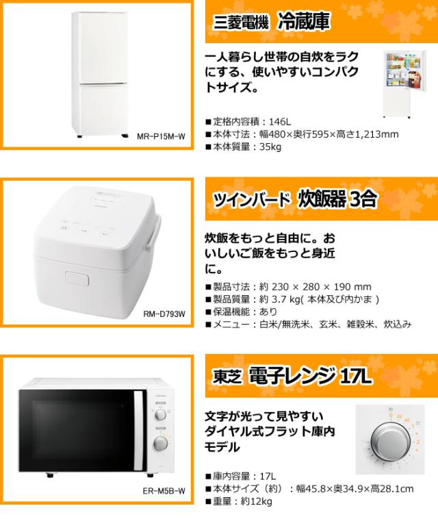 シングル・一人暮らし・新生活に最適♪ 人気商品で間違いなし! 冷蔵庫・炊飯器・レンジのポピュラーキッチンセット [冷蔵庫]三菱電機(MR-P15M-W) [レンジ]東芝(ER-M5B-W) [炊飯器]ツインバード(RM-D793W) ※記載は商品仕様の一部です。仕様説明不足等の理由での返品はできません。特に適合等は必ずご確認ください。