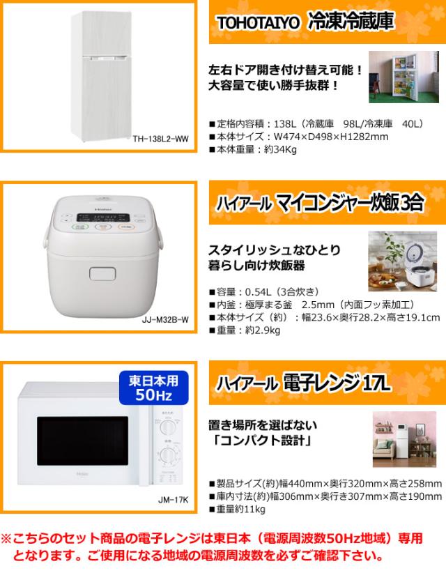 シングル・一人暮らし・新生活に最適♪ とにかく安く済ませたい! 冷蔵庫・炊飯器・レンジ(東日本50Hz専用)のリーズナブルキッチンセット [冷蔵庫]TOHOTAIYO(TH-138L2-WW) [レンジ]ハイアール(JM-17K-50-W) [炊飯器]ハイアール(JJ-M32B-W) ※こちらの商品は東日本(電源周波数50Hz地域)専用となります。ご使用になる地域の電源周波数を必ずご確認下さい。 ※記載は商品仕様の一部です。仕様説明不足等の理由での返品はできません。特に適合等は必ずご確認ください。