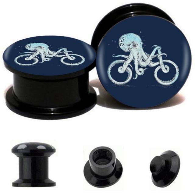 ダブルフレアの黒のアクリルプラグにまるで蛸が自転車に乗っているように見えるトリックアートのような面白いデザインのボディピアス。個性的でユニークなタコが存在感を発揮してくれるオススメのボディーピアス!