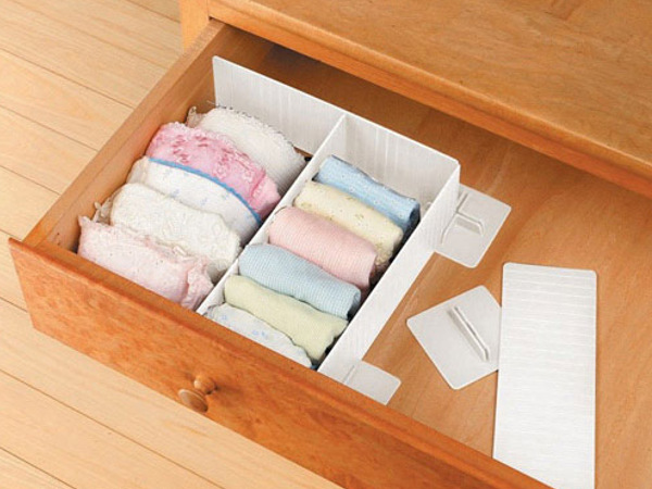 衣類収納の引き出し内をきっちり整理整頓できる仕切り板です。下着や靴下、ベルト、ネクタイ、ハンカチ等の収納に最適です。自立スタンド式で1枚だけでも自立し、縦だけ、横だけでの仕切りも可能です。シングルスタンドとクロススタンドを使って、連結させたり十字やT字に区切ることもできます。また、1cmきざみで簡単にカットできるので、タンスや引き出しのサイズに合わせてお使い頂けます。