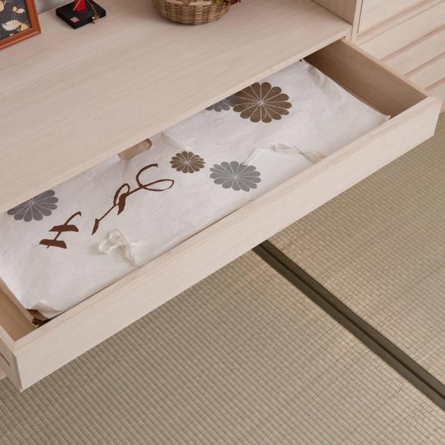 引出しの幅は、着物を収納した長めのたとう紙でも折らずに収納できるサイズなので、しわになりにくく安心して収納することができます。
