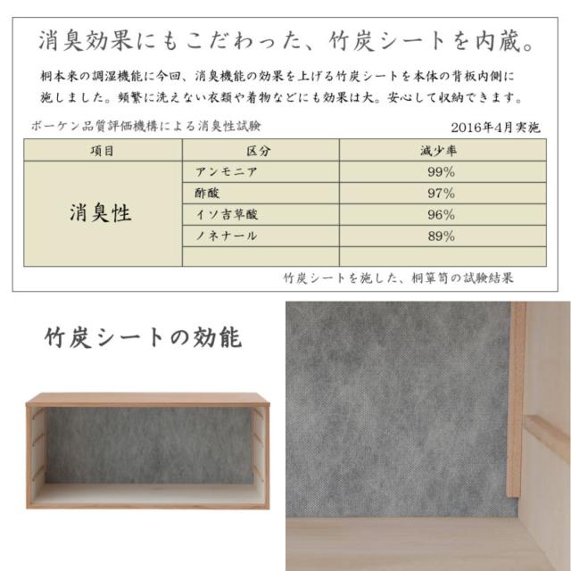 | 材質 | 本体:天然木(桐材) 引出底板、背板:天然木桐化粧板 背板内面:竹炭シート内臓不織布 |
