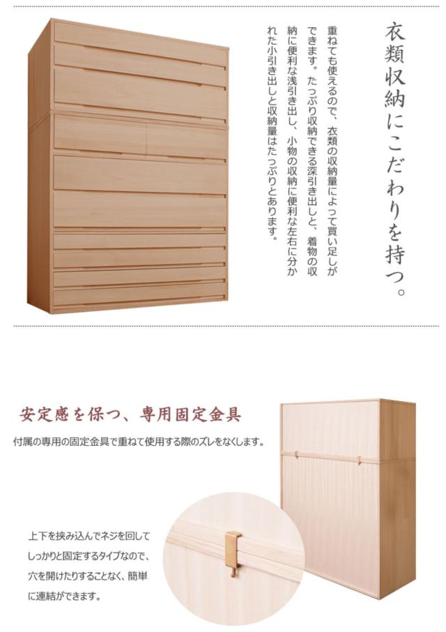 床に直接置いて単体での使用はもちろん、シリーズ品と組み合せて上置き用としての使用も可能な桐タンスです。