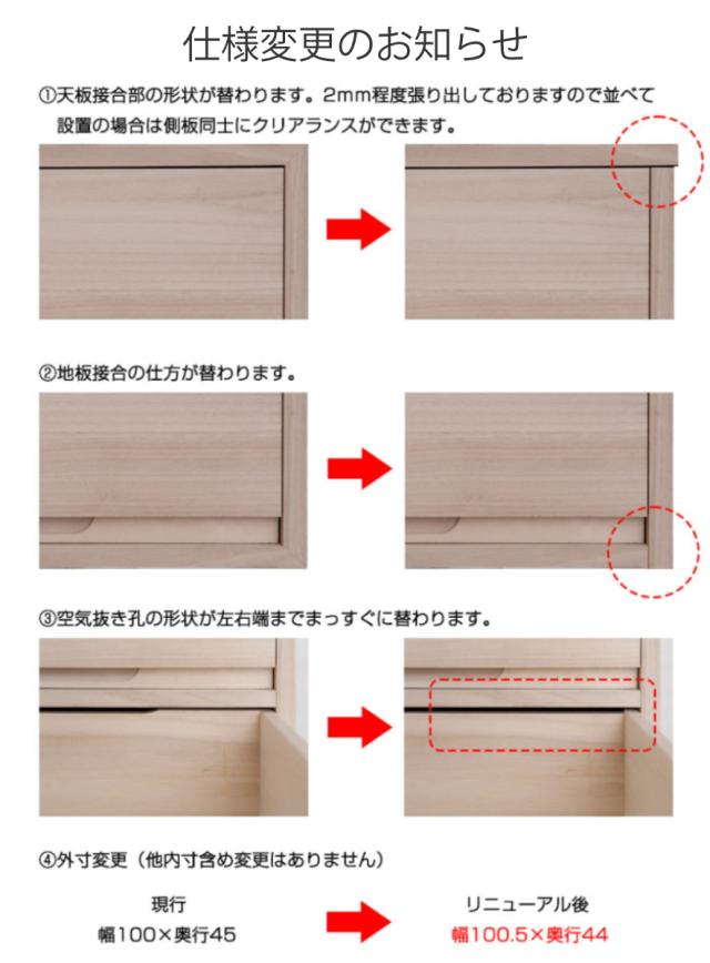 | サイズ | 約 幅100.5×奥行44×高さ44(cm) 引出し内寸:約 幅93.5×奥行38.5×深さ(浅)10、(深)17cm |