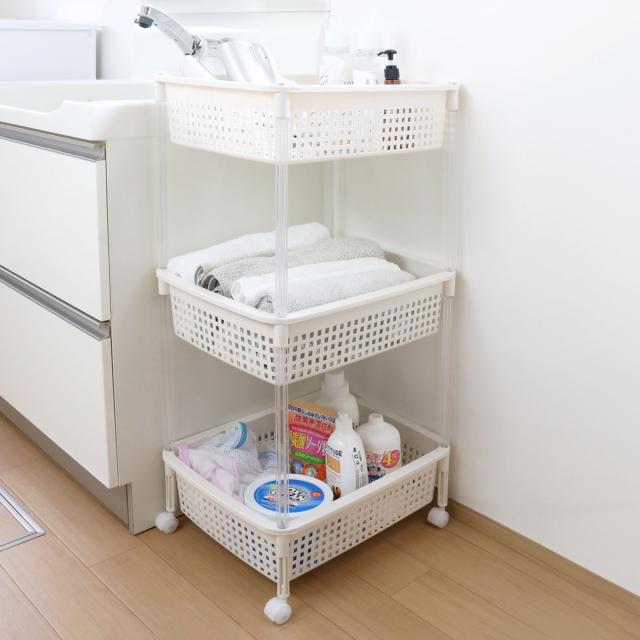 洗濯機周りのサニタリー用品の収納に便利なバスケットワゴンです。バスタオルやバスローブ、洗濯洗剤のストックなどをまとめて収納できます。洗濯機横に設置すれば、デッドスペースを有効活用できます。