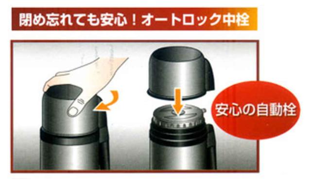 中栓が開いたままでも、上蓋を閉めれば自動でロックが掛かって中身が出ません。うっかり閉め忘れても、安心してご使用できます。
