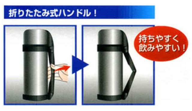 丈夫な折りたたみ式ハンドルを採用しています。引っ張るとハンドルが固定します。持ちやすく、飲みやすいので大変便利です。