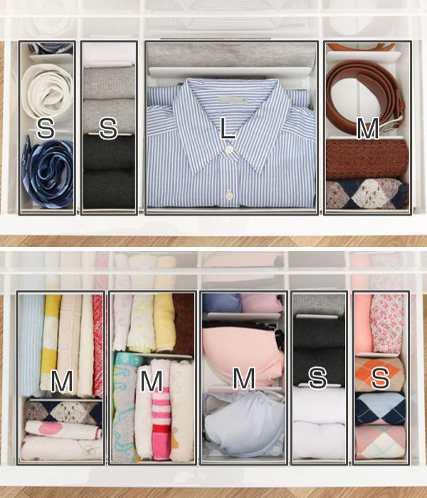 仕切りケースは、S・M・Lの奥行、高さが一緒なので、同サイズや別サイズと組み合わせて使えば、さらにすっきりまとめて収納ができます。引き出しサイズに合わせて組み合わせは自由自在で、自分好みの収納スペースを作ることができます。また、ケース同士はズレないように連結も可能です。