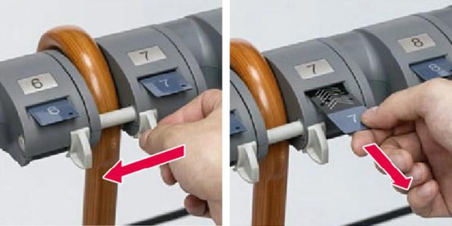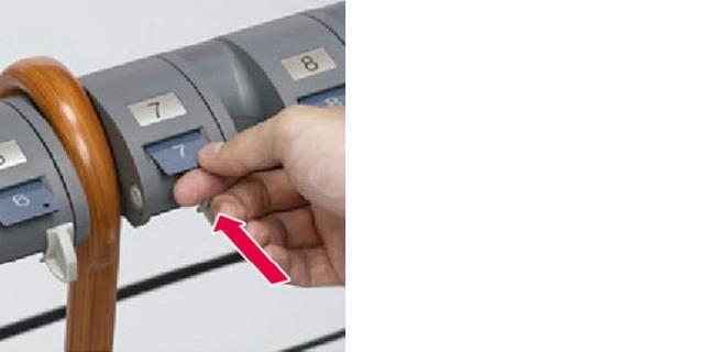 | 01 傘をくぼみに引っ掛けてレバーを動かします。 | 02 カギが手前に出てくるので引き抜くとロックされます。 |
