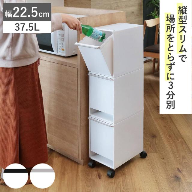 ゴミ箱 37.5L 3段 資源ゴミ分別 キッチン ( ごみ箱 37.5リットル 3分別 フラップ ふた付き 縦型 スリム 幅22.5cm 隙間 収納棚 ストッカー ダストボックス 引き出し フラップ棚 分別ゴミ箱 キャスター付き 収納 )