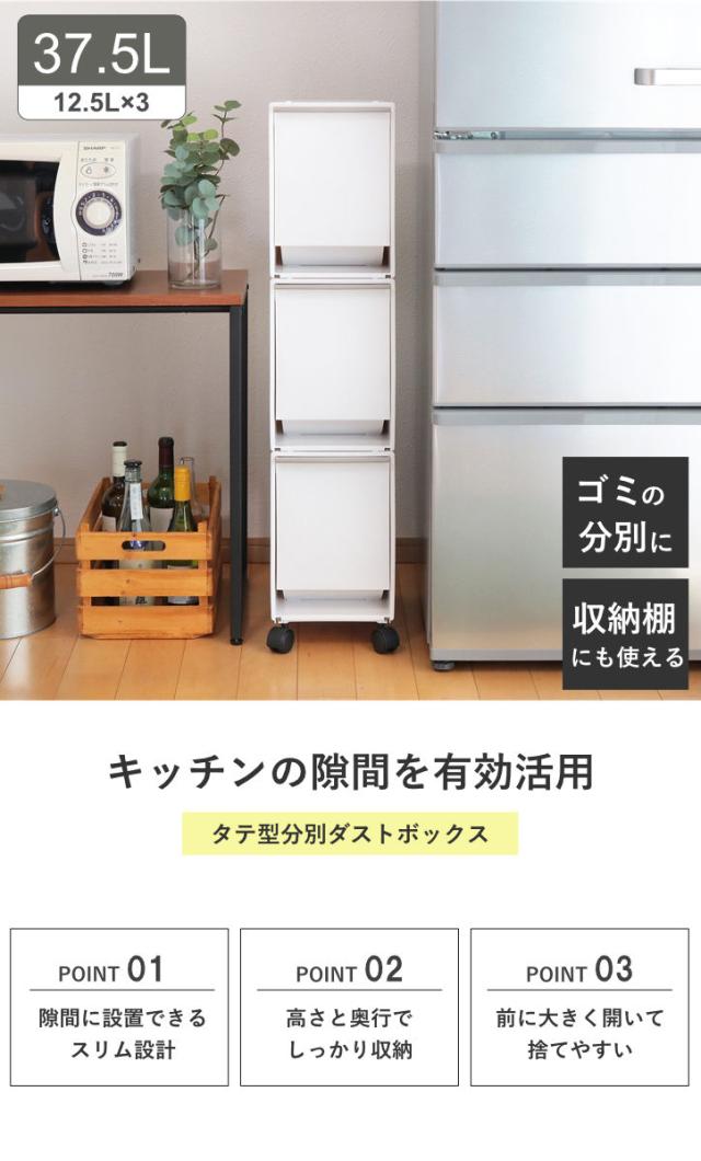 キッチンの空間を有効に使える幅約22.5cmのスリムなダストボックスです。冷蔵庫・シンク・食器棚横などのキッチンのデッドスペースに設置できて、ペットボトル・缶などのかさばる資源ゴミもひとまとめにできます。