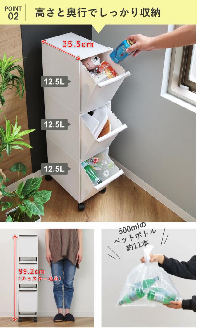 高さが99.2cm、奥行が35.5cmあるので、スリム形状でもしっかり収納できます。一段の容量は約12.5L、500mlのペットボトルを約11本入れることができます。