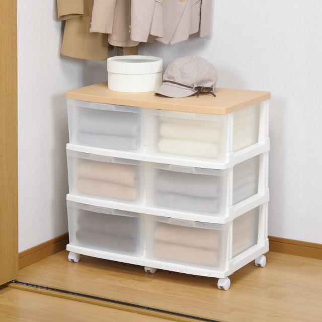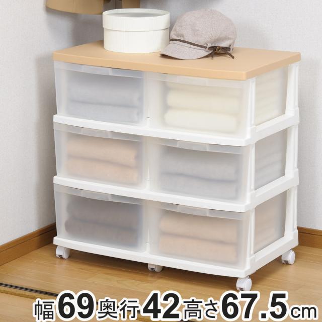 収納ケース エミング 深型ストッカー 木天板 ナチュラル天板 ( 幅69×奥行42×高さ67.5cm クローゼット 収納 3段 6杯 プラスチック 引き出し 日本製 大容量 キャスター付き 押し入れ チェスト 収納ボックス 衣装ケース おもちゃ箱 )