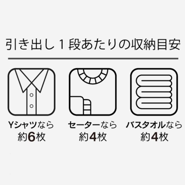 1段当たりの収納目安は、Yシャツ約6枚、セーター約4枚、バスタオル約4枚です。