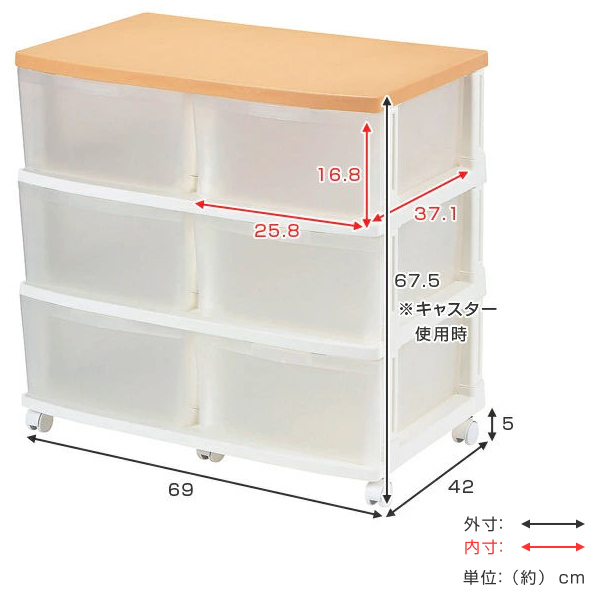 | サイズ | 外寸:約 幅69×奥行42×高さ67.5(cm) 内寸:約 幅25.8×奥行37.1×高さ16.8(cm) キャスター高さ:5(cm) |