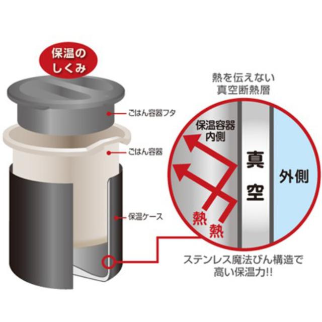 ごはん容器は真空断熱層で温かく保温、いたみやすいおかずは常温でキープします。