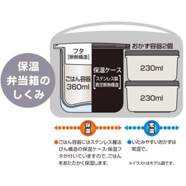 ●温かいごはんを魔法びんで保温、いたみやすいおかずは常温のままセットで持ち運べる、お弁当箱です。