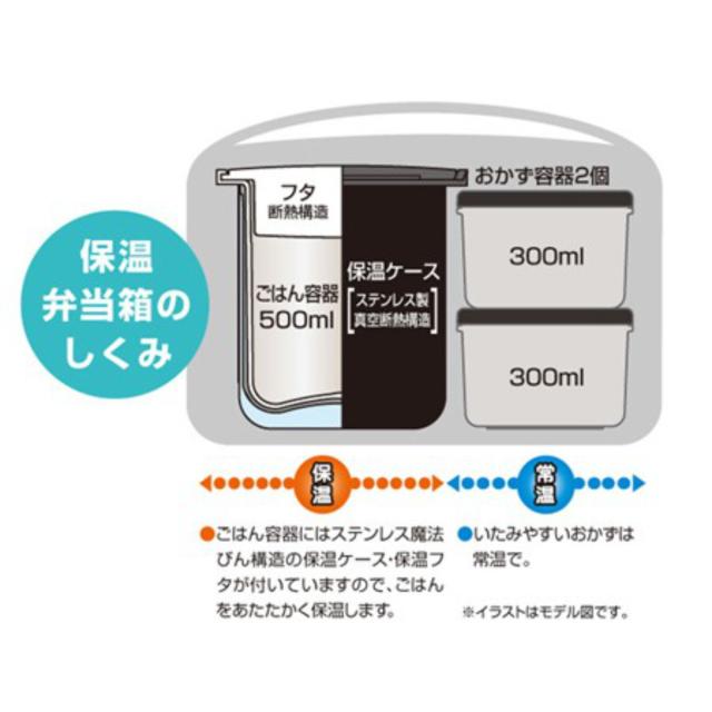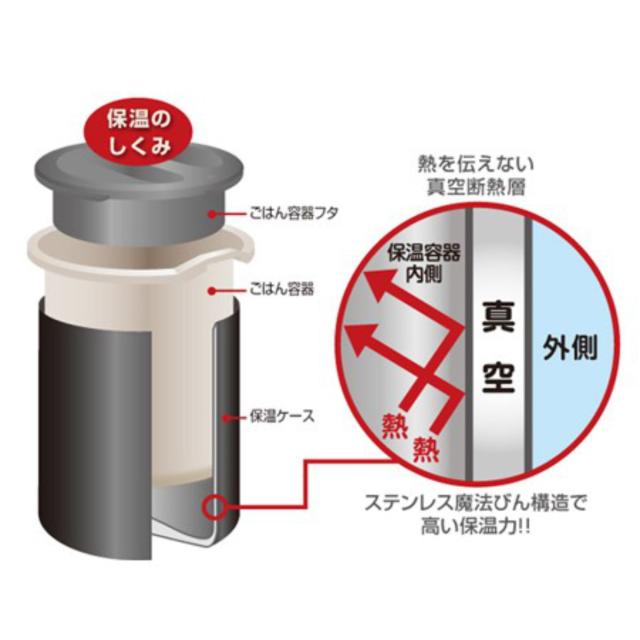●温かいごはんを魔法びんで保温、いたみやすいおかずは常温のままセットで持ち運べる、お弁当箱です。