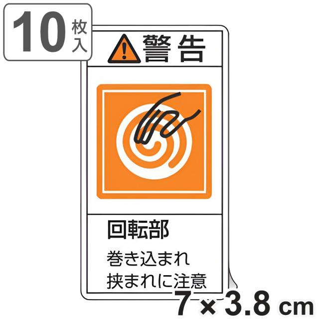 PL警告表示ラベル 「 警告 回転部 巻き込まれ〜 」 小 7×3.8cm タテ型 10枚組 ( ステッカー 7×3.8センチ 10枚 表示シール 表示 表示シート PL法対策 指示 注意喚起 標示 看板 安全用品 回転 巻き込まれ 挟まれ 注意 )