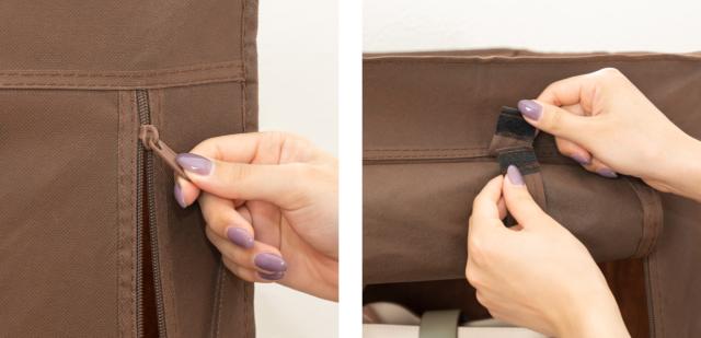 開け閉めがしやすいファスナー式です。巻き上げて上部の面ファスナーで固定すると、全開しておくことができます。ゆっくりお洋服を選びたい時に便利です。