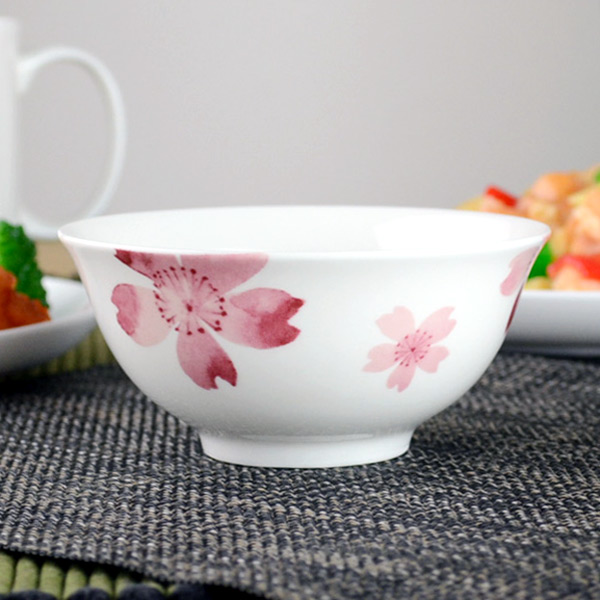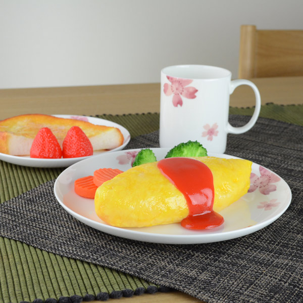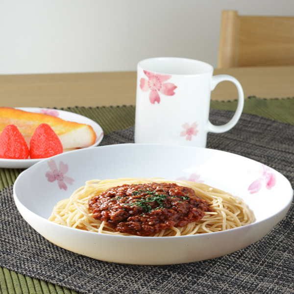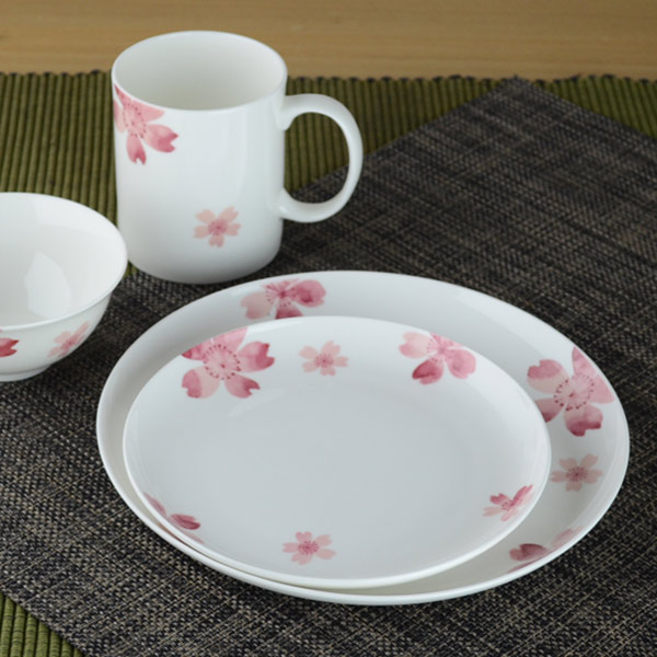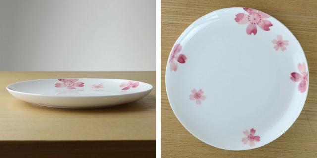温かみのある乳白色と滑らかな質感、美しい透過性が特徴の最高級磁器「ボーンチャイナ製」。水彩調の淡い落ち着いた桜のデザインで幅広い世代の方に好まれます。お料理が上にのっても、チラリと見えるピンクの桜が食材を彩ります。メインメニューの盛りつけや、家族分の大皿料理にもぴったりのサイズです。