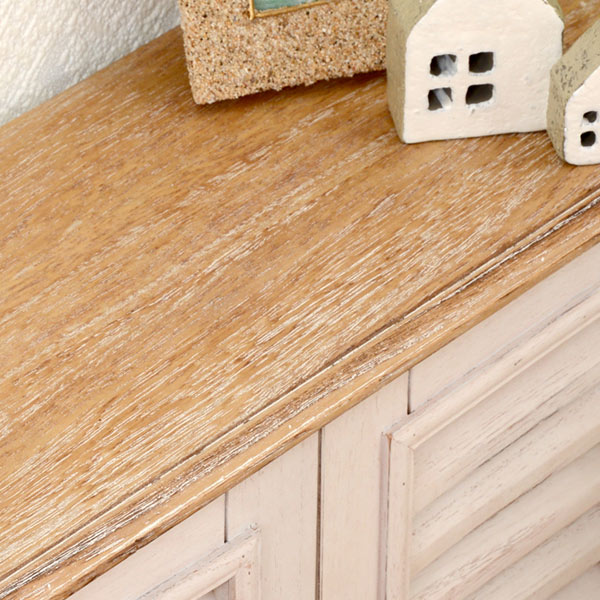 丁寧に使い込まれたような独特の質感が味わい深く、ホワイトカラーが可愛らしさを演出してくれます。天板はやさしい木目のナチュラルカラーです。