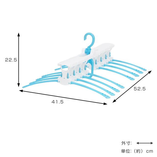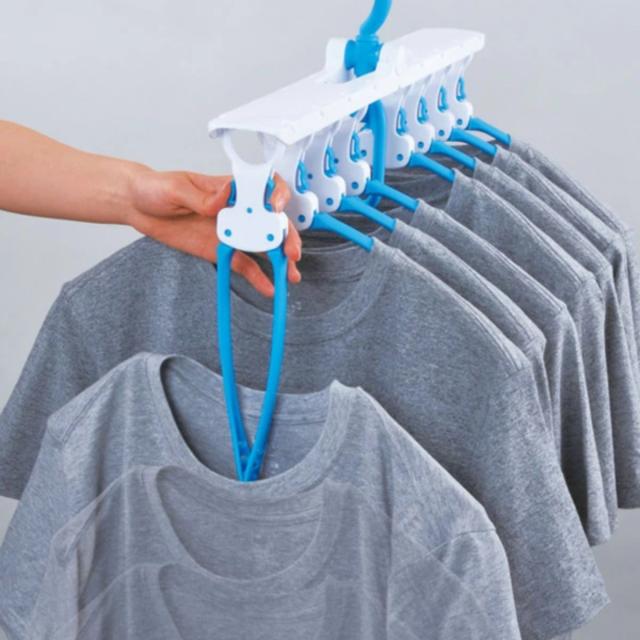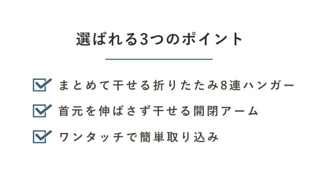 ハンガー8本分をまとめて干せ、コンパクトに折りたためる8連ハンガーです。風が吹いても衣類が偏らず、等間隔で干せるので乾きやすく、省スペースでたっぷり干せます。