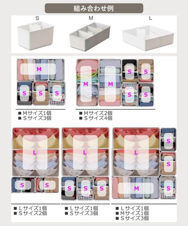 ![]() ショーツの収納に便利!Sサイズ2個組 | ![]() キャミソールの収納に便利!Mサイズ | ![]() ブラジャーの収納に便利!Lサイズ |