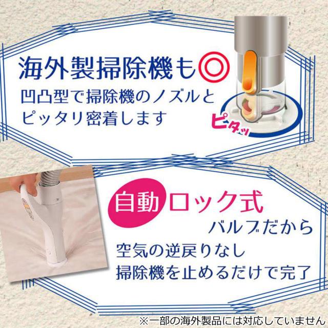 | 注意事項 | ※一部の掃除機に対応していない場合があります ※スティックタイプやハンディタイプの掃除機では吸引力が弱いため圧縮できません。キャニスタータイプの掃除機をお使いください ※掃除機のノズルが凹型の製品には対応していません。 |
