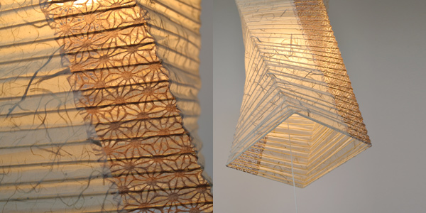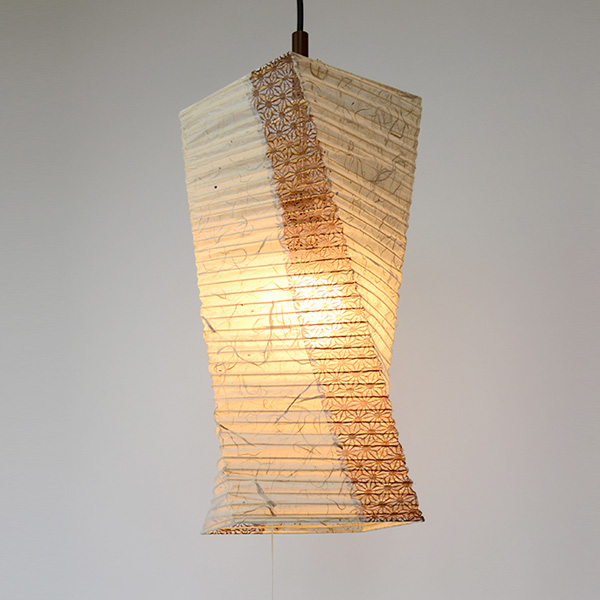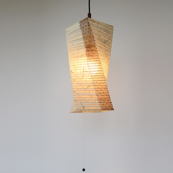 ひねりをいれたフォルムが特徴的な和風ペンダントランプです。和紙シンプルな楮紙と縦に透かしの黒雲龍の和紙をつかい、デザイン性を高めました。