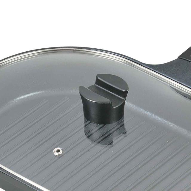 蓋のつまみに溝が付いているので、菜箸やターナーなどを置くことができます。調理中のちょい置きにとても便利です。蓋は透明なガラスなので、焼け具合を見ながら調理できます。