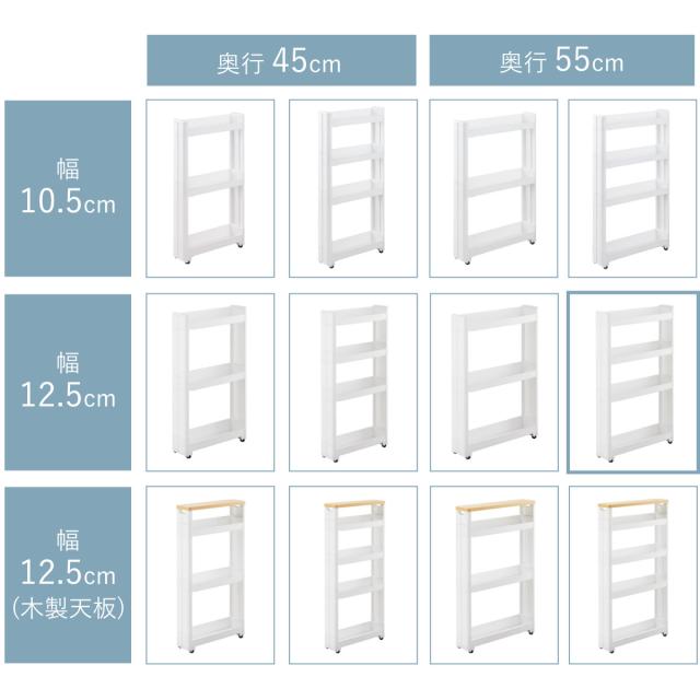 ご家庭の隙間にぴったり合うように幅・奥行・天板のタイプの中から全部で12通りの豊富なサイズ展開をご用意しています。使う場所や収納したい物に合わせてお好みのサイズをお選びください。
