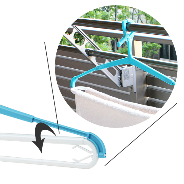 ●アームを伸ばしてバスタオル用、アームを縮めて通常衣類用、アームを回転させて速乾用と様々な使い方ができるアイデアハンガーです。
